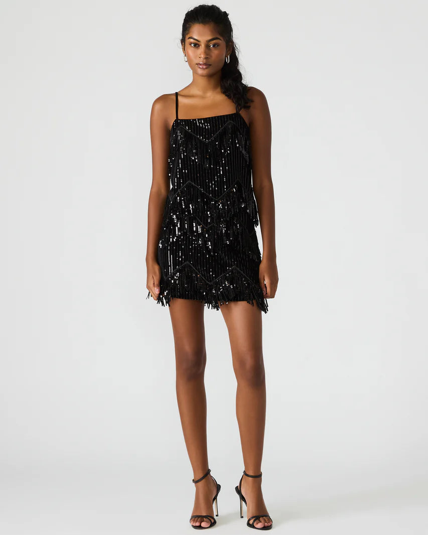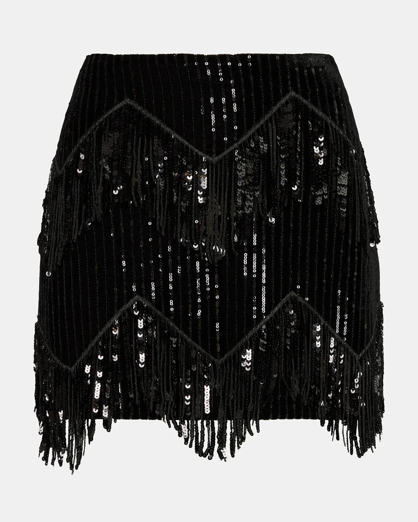 Elevate your evening style with the CINDI SEQUIN SKIRT BLACK. This skirt features shimmering sequin embellishments arranged with dynamic fringe detailing, adding movement and a bold statement to your look. Designed as part of a matching set, it offers a coordinated fashion-forward ensemble perfect for special occasions or nights out. The skirt’s luxurious finish and fluid fringe create eye-catching flair while maintaining effortless wearability.