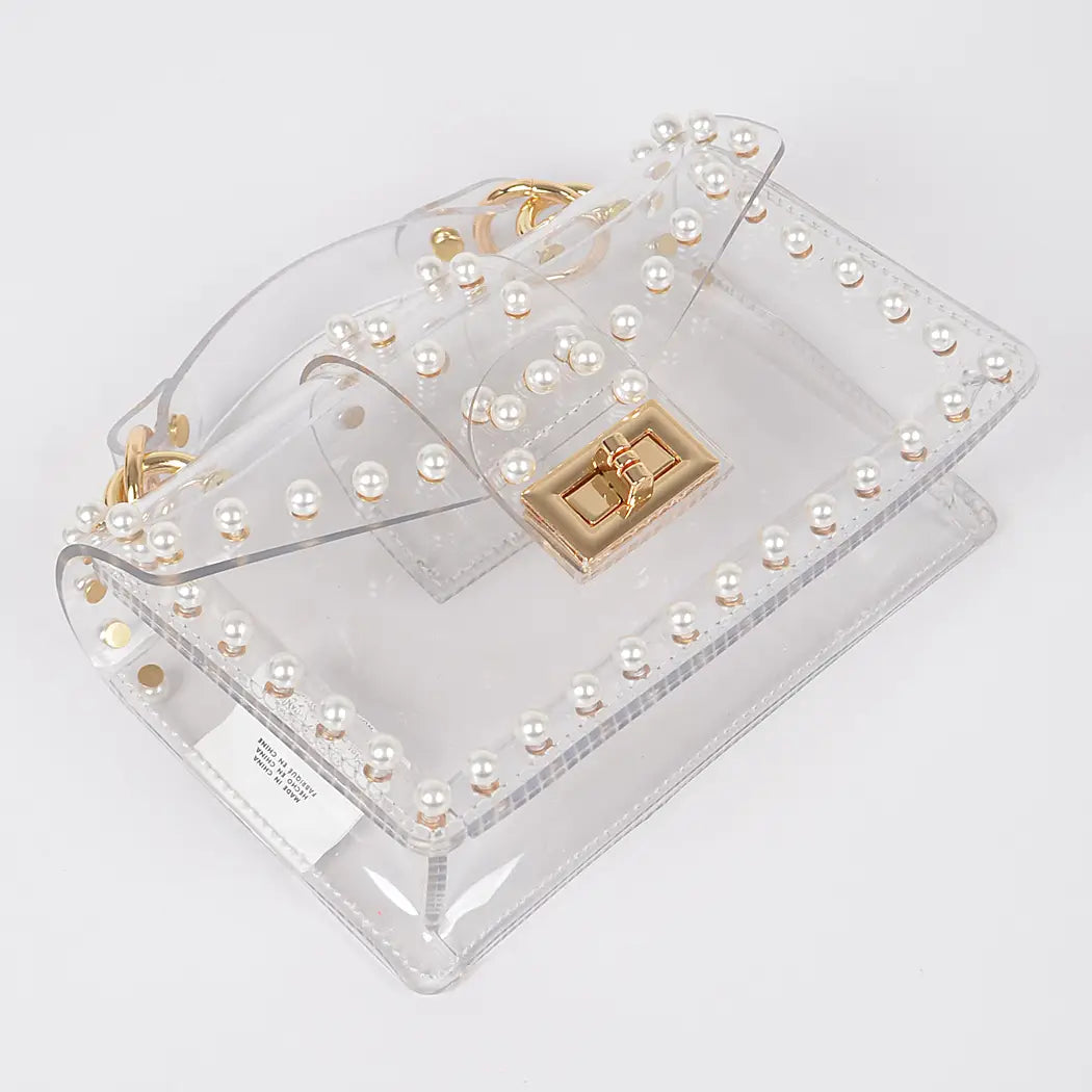 * Transparent Single Handle Clutch W/Faux Pearl * 7.5W*4H*2.25D * Pvc,Mixed Metal.