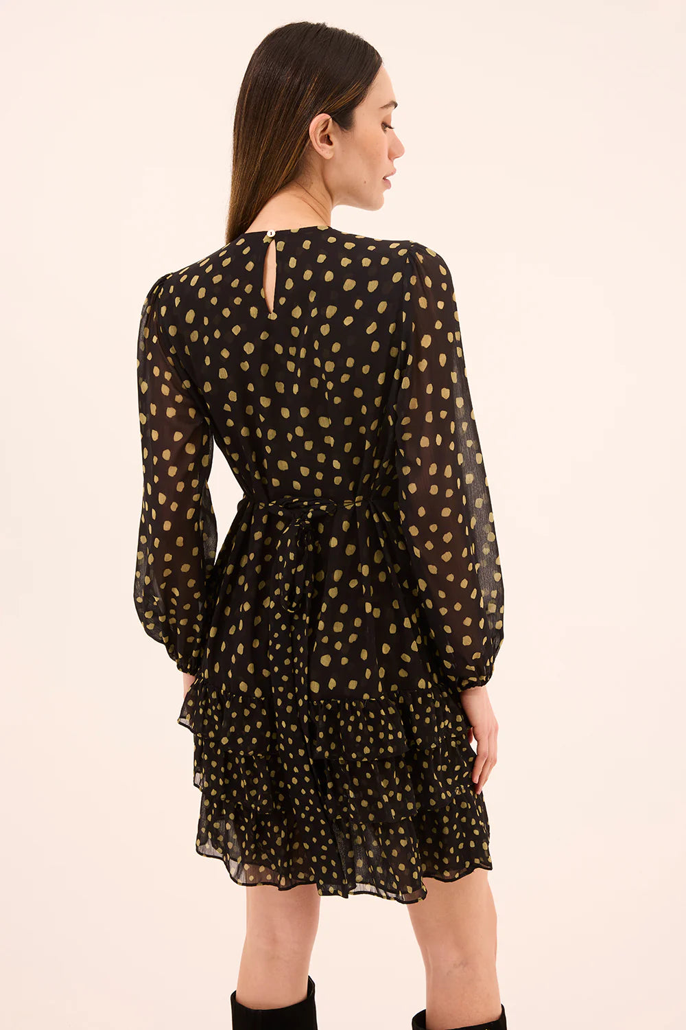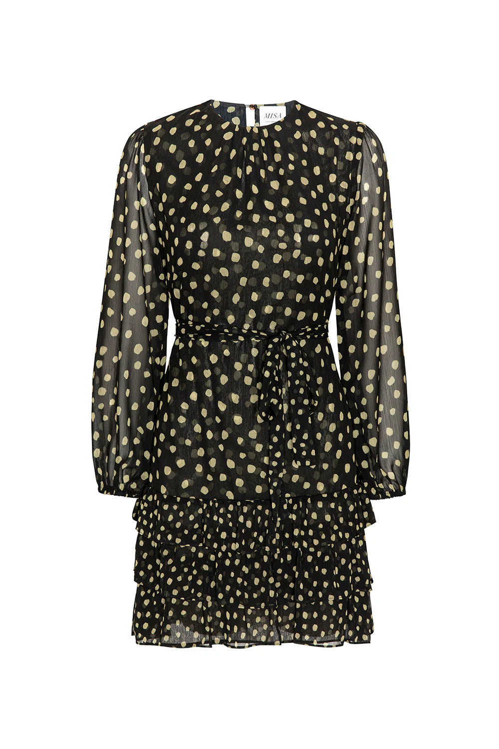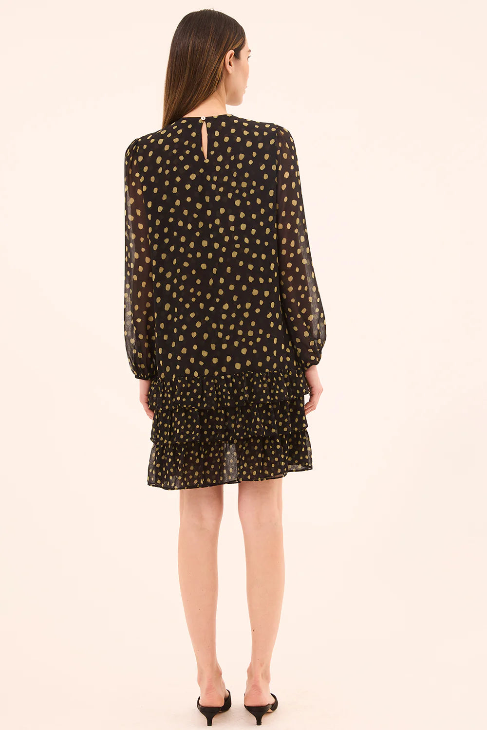 The Cleo Dress is a fresh mini silhouette cut from timeless gold polka-dot chiffon. Designed in a shift style with a drop waist and playful double ruffle hem, it features a high gathered neckline, long sheer blouson sleeves with elastic cuffs, and a single-button keyhole closure. The body is double-lined for coverage and comes with an optional removable tie belt. Effortlessly versatile, it pairs with everything from heels to boots as the seasons change.