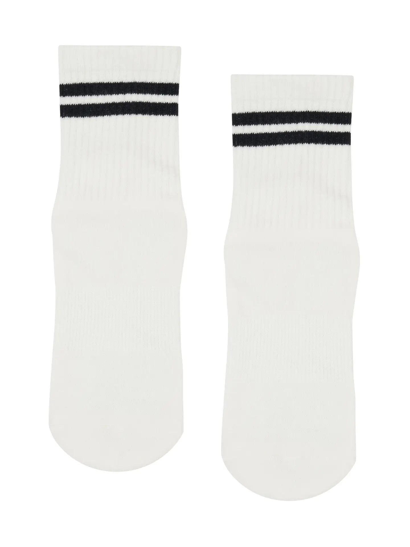 Experience unmatched comfort and stability with our Crew Non-Slip Grip Socks in Sporty Stripe Ivory. Perfect for Pilates, yoga, gym workouts, or lounging, these socks offer superior grip, support, and style. Features: - Anti-Slip Grip: Non-slip PVC grips provide excellent traction on any surface, preventing slips during activities. - Comfortable Fit: Crafted from breathable materials for a snug, second-skin feel with elasticized cuffs that stay in place. - Enhanced Arch Support: Arch compression alleviates foot fatigue and offers added stability. - Hygienic & Moisture-Wicking: Keeps feet dry with moisture-wicking fabric and anti-bacterial properties for hygiene. - Versatile Style: Available in stylish designs to express your personality. Ideal for: Pilates, Yoga, Barre. Composition: 80% Cotton, 16% Polyester, 4% Elastane Care: Warm machine wash, no tumble dry, dry clean, or ironing.