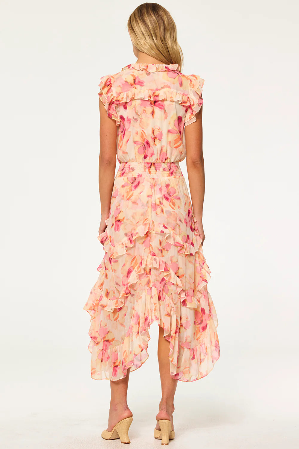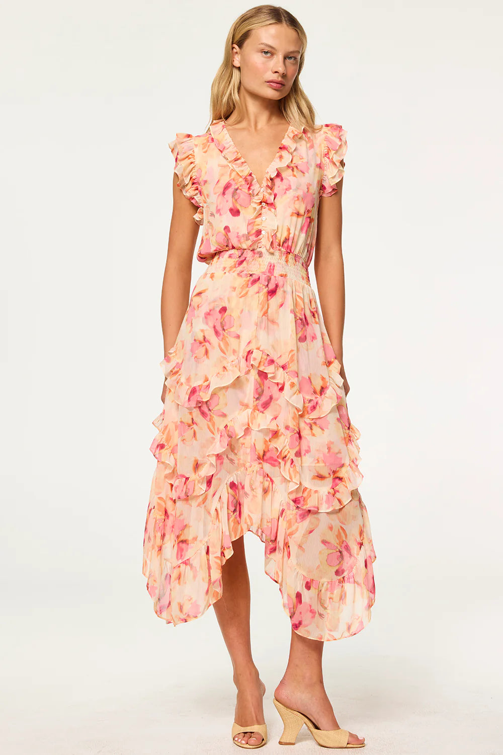 Chic and universally flattering, the best-selling Dakota is a playful yet polished midi dress designed to take you seamlessly from desk to dinner. Cut from a flowing Watercolor Floral print chiffon, it features a buttoned V-neckline framed with soft ruffle trim and delicate ruffle accents at the shoulders. A smocked elastic waist cinches the silhouette, flowing into a tiered, ruffle-trimmed hem.