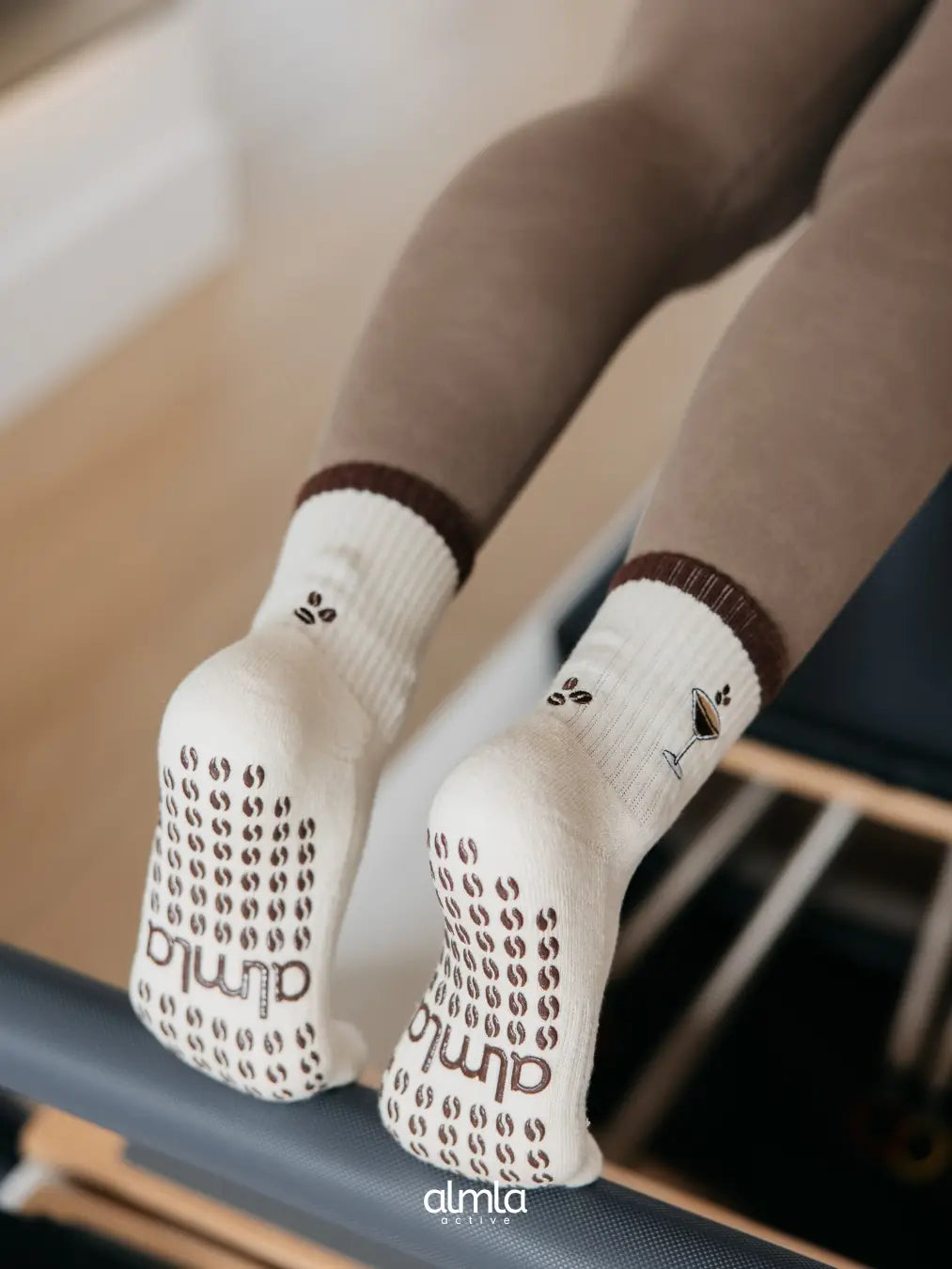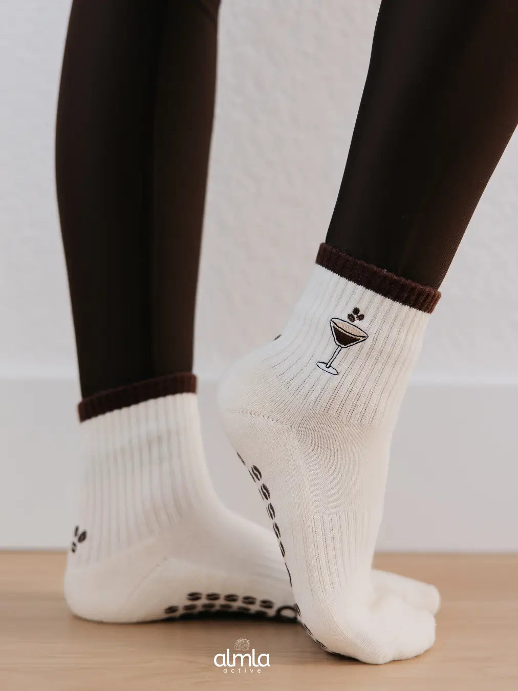 Introducing Espresso Martini Pilates Grip Socks Featuring embroidered espresso martini details on a cream sock, espresso bean detail on the back, and custom espresso-bean-shaped non-slip grips for the perfect blend of style and stability in the studio or on the go. Crafted from a premium cotton blend for comfort, durability, and breathability, these cream & brown Pilates grip socks pair effortlessly with your neutral and coffee-toned activewear or everyday loungewear. Crafted for comfort and durability: 85% Cotton | 12% Nylon | 3% Spandex Size fits US Women's 5-10