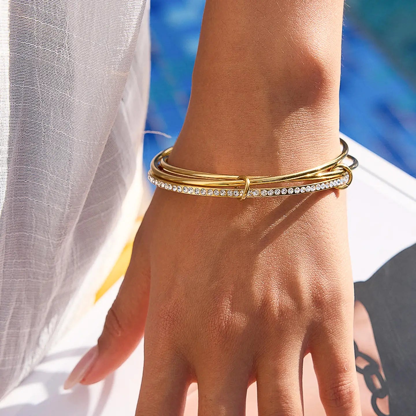 18K Gold Non-Tarnish Rhinestone Stack Bracelet 18K Gold Plating Stainless Steel Pendant Size (inch): 0.3 Diameter Chain Length (inch): 7.42 Extension Length (inch): 2.36