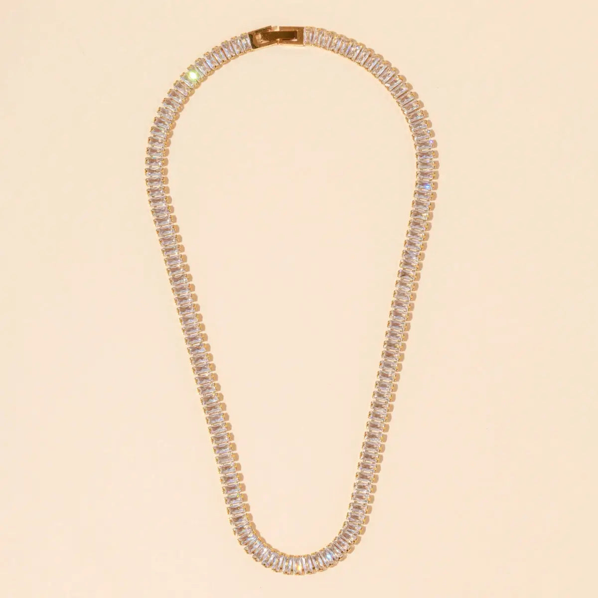 Crafted with the finest 18K gold plated stainless steel, this necklace exudes elegance and sophistication. Adorned with radiant clear crystals, it adds a touch of glamour to any ensemble. The durable material ensures long-lasting shine and beauty, making it a timeless piece for any jewelry collection. 16" + 2" Extender