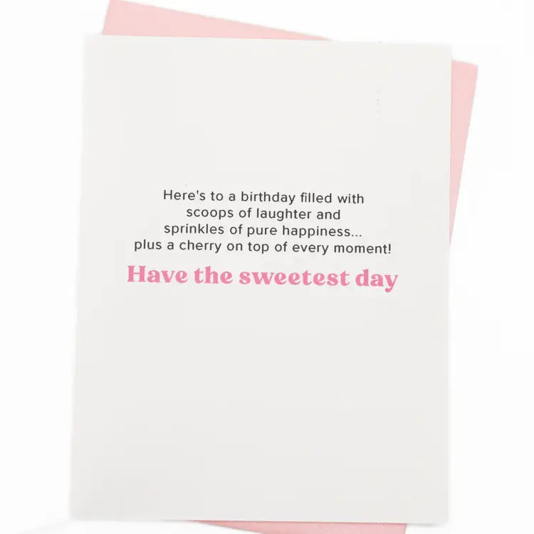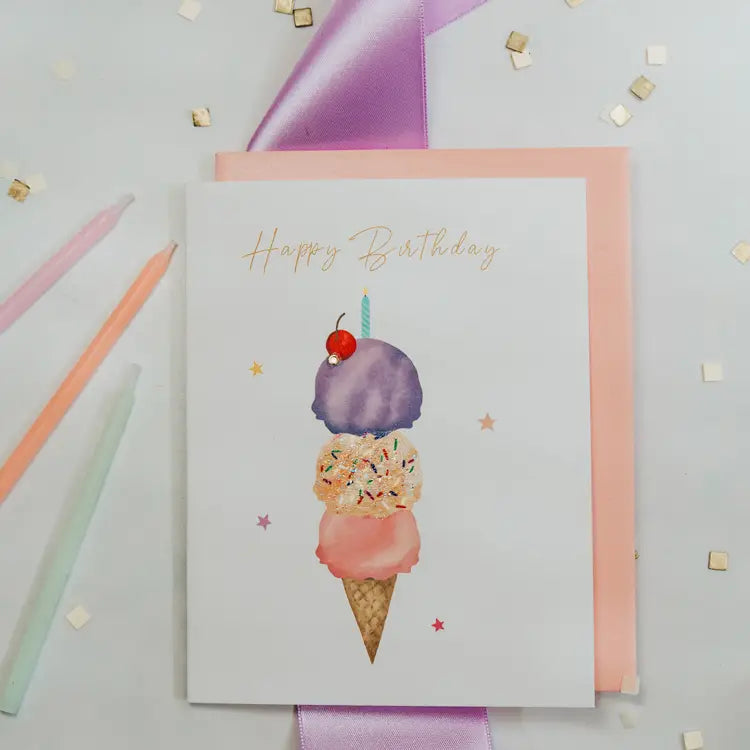 Indulge in a scoop of happiness with our delightful ice cream with a 'Cherry on Top' Birthday Greeting Card from Lavender Vines! Overflowing with sweetness and sprinkled with joy, this card is the perfect treat for celebrating another year of life's delicious moments. Lavender Vines birthday cards embody a sense of sophistication, elegance, and romance...but with a playful twist, making every birthday moment even more memorable. Inside message: Here's to a birthday filled with scoops of laughter and sprinkles of pure happiness...plus a cherry on top of every moment! Have the sweetest day CARD DETAILS SIZE - Each card measures 4.25 x 5.5 inches which is the standard A2 card size and includes a corresponding A2 envelope. EMBELLISHMENT - Rhinestone gems and glitter PROCESS - Each card is crafted with love and care, first printed on a premium, heavyweight cardstock and then embellished by hand with glitter and gems. ORIGIN - Made in the USA