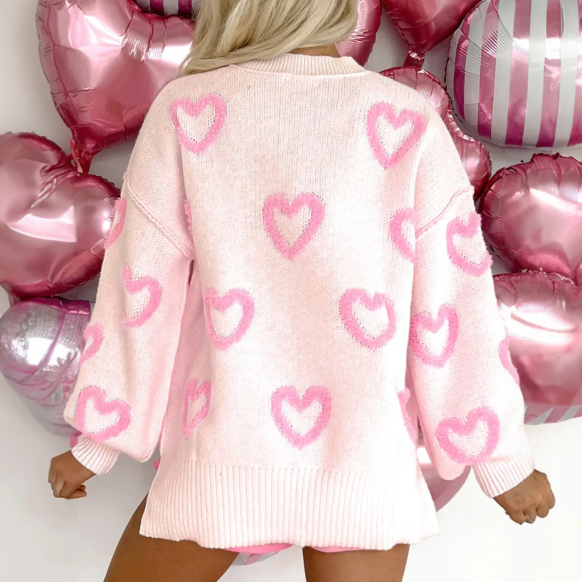 Crafted from premium knit fabric, this heart sweater combines timeless elegance with contemporary style. The delicate heart motif adds a touch of romance to your everyday wardrobe, while the soft, breathable material ensures all-day comfort. Perfect for layering or wearing solo, this versatile piece transitions seamlessly from casual outings to relaxed evenings. Available in a sophisticated pink hue that flatters a range of skin tones. An essential addition to any thoughtfully curated closet.