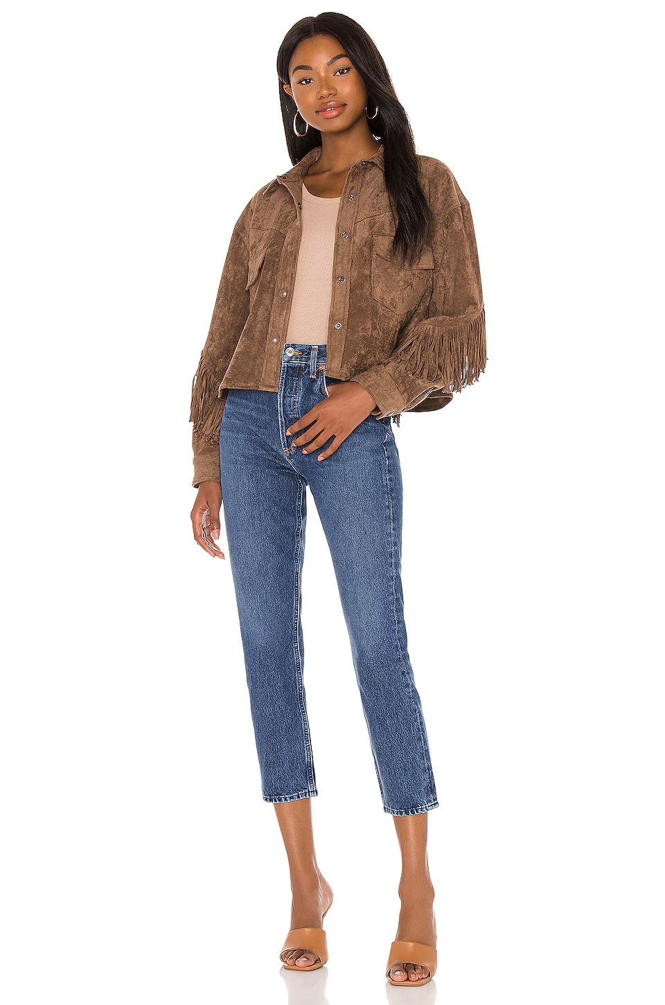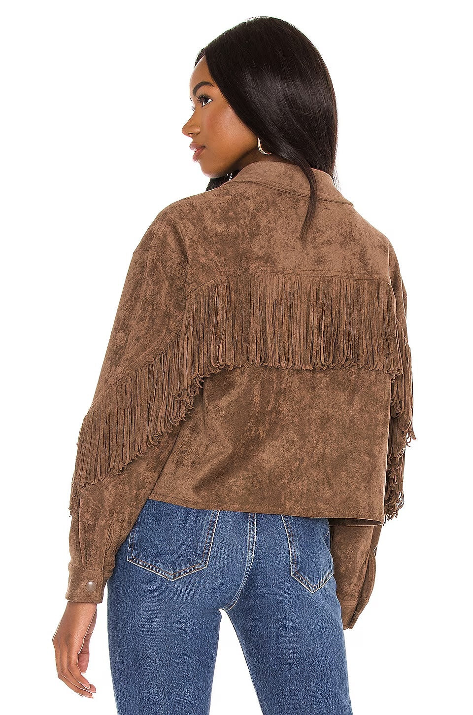 Faux Suede Shirt Jacket with Fringe Detailing Along Back, arm and Sleeve