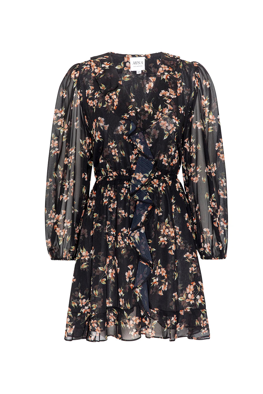 The Iris dress is a chic mini faux-wrap silhouette cut from our Autumn Cluster printed chiffon on a black ground. A ruffle trim frames the V-neckline and cascades down the center front to the hem, adding a touch of romance. The flowing mini-length skirt is double lined, while the elasticated waist offers comfort and shape. Finished with long, semi-sheer blouson sleeves.