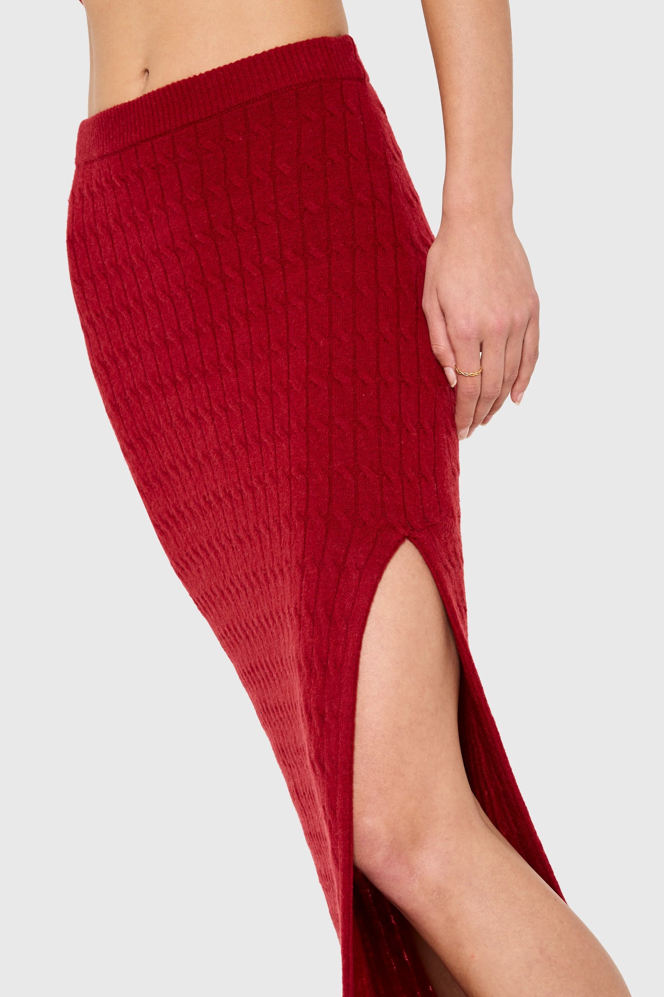 Reimagine sweater-weather in the Isla Skirt, a comfortable staple with a hint of edge. This mid-rise cable knit skirt features a high slit on the left leg. Ribbed details at the waistband and hem add a polished touch, while the elastic waistband ensures a comfortable, flexible fit. Pair it with the Isla Top to enjoy the fall in this relaxed but elevated set—perfect for staying sleek as the weather cools.