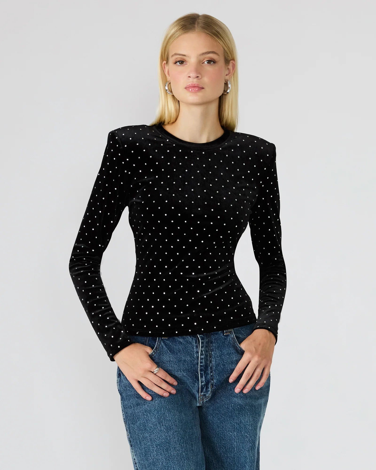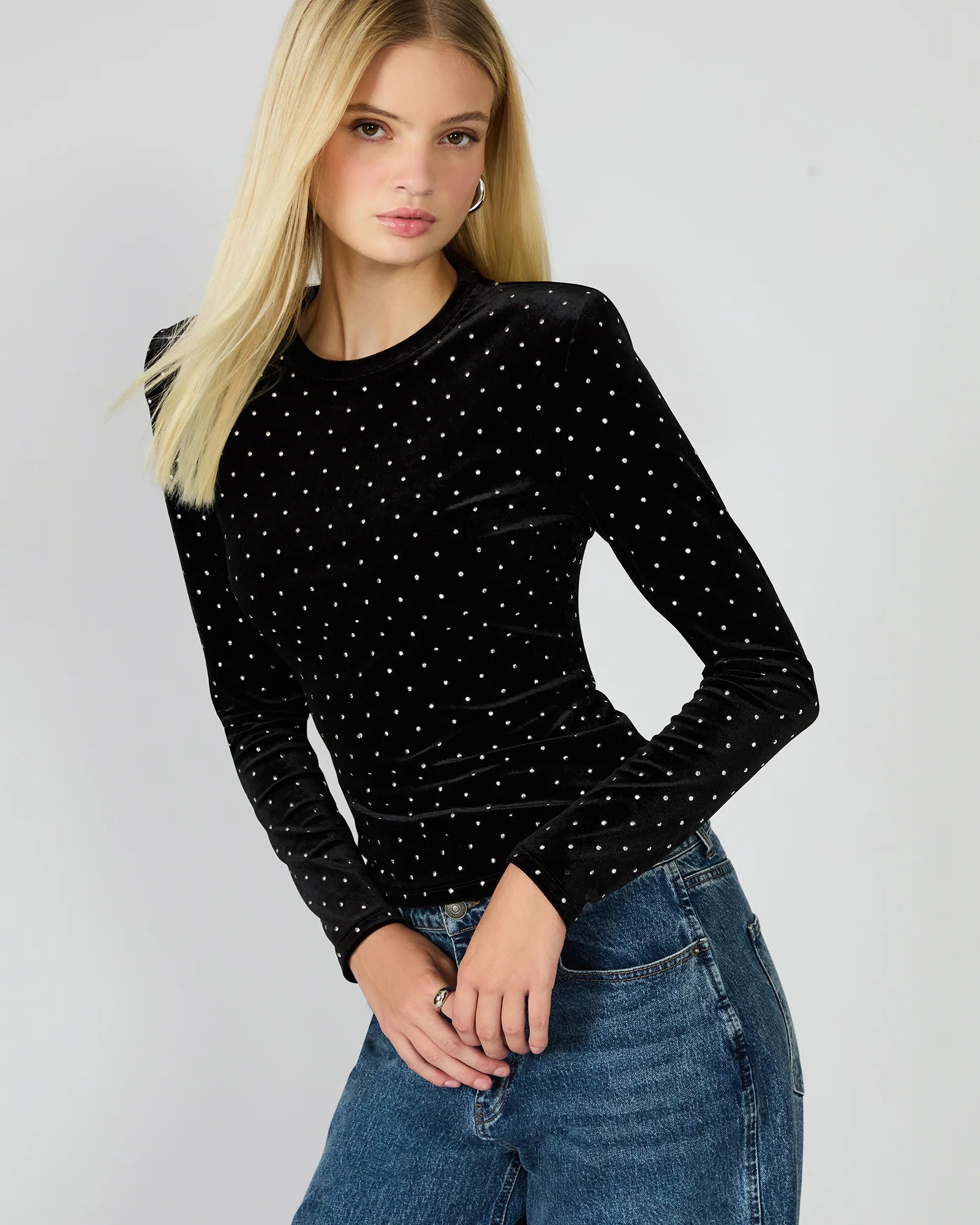 Elevate your wardrobe with the MADILYN STUDDED VELVET TOP BLACK. This long-sleeved piece features intricate rhinestone and stud embellishments on luxurious velvet fabric, combining texture and sparkle for a sophisticated statement. Perfect for evening events or upscale outings, it offers an expert blend of edgy detail and refined elegance.