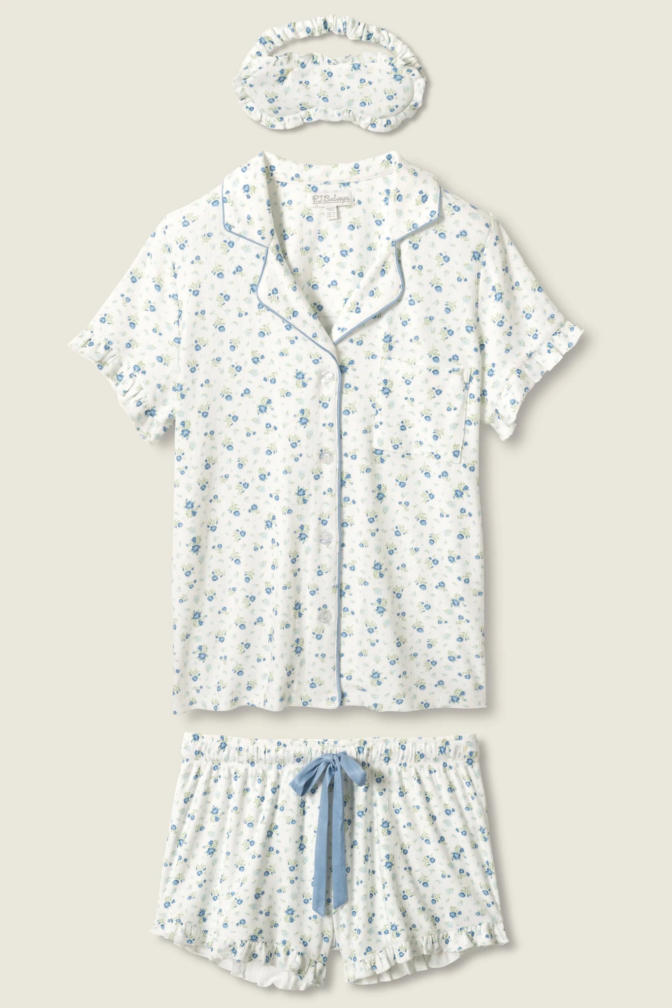 Soft ivory florals meet delicate ruffles in this dreamy three-piece pajama set. Crafted from double-brushed pointelle that’s smooth and lightly textured, it includes a short-sleeve button-down top, ruffled shorts with a blue drawstring, and a matching eye mask trimmed in frill. The tiny blue blossoms add a sweetly vintage touch—made for mornings that linger and nights that wind down softly.