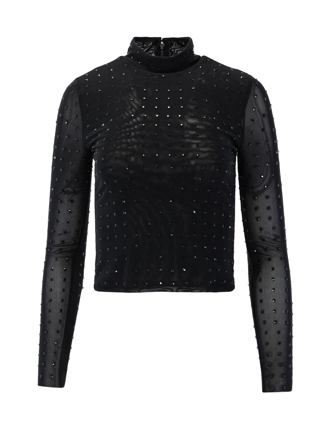 The MELVINA top is a sophisticated and versatile choice for any wardrobe. With a sleek mock neck and long sleeves, this top offers both coverage and style. The delicate mesh sheer fabric adds a touch of elegance, while the square-shaped embellishments provide a subtle yet glamorous touch. Perfect for any occasion, this top is a must-have for any fashion-forward individual.