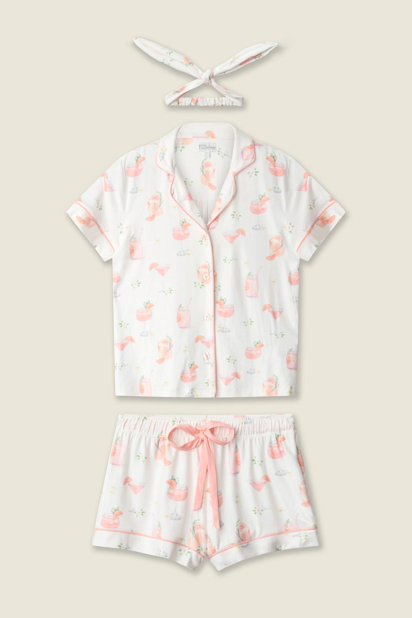 A nightcap, but make it a set. This ivory three-piece pajama set is crafted in mid butter jersey with a smooth, stretchy feel and printed with playful paloma cocktails throughout. The short sleeve button-front top pairs with relaxed lounge shorts, while the matching eye mask completes the look with a coordinated finish.