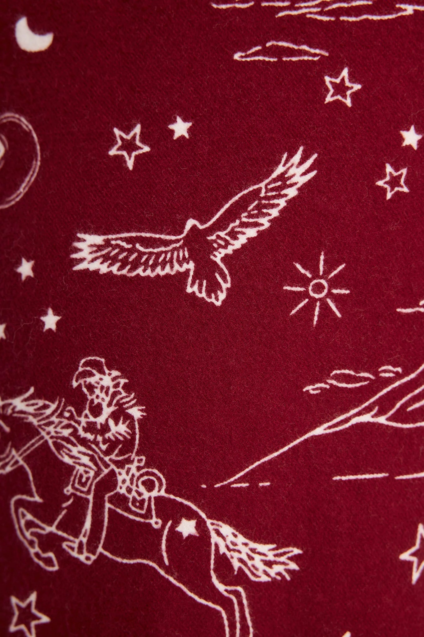 As if soft flannel wasn’t cozy enough, this pair brings the Wild West to your downtime. Crafted in a classic twill weave, these full-length lounge pants come in a rich burgundy hue and feature an allover print of riders on horseback, cowboy hats, horseshoes, soaring birds, stars, and mountain ranges. The relaxed fit and adjustable drawstring waist make them a dream for curling up, catching Zs, or imagining yourself under open skies.