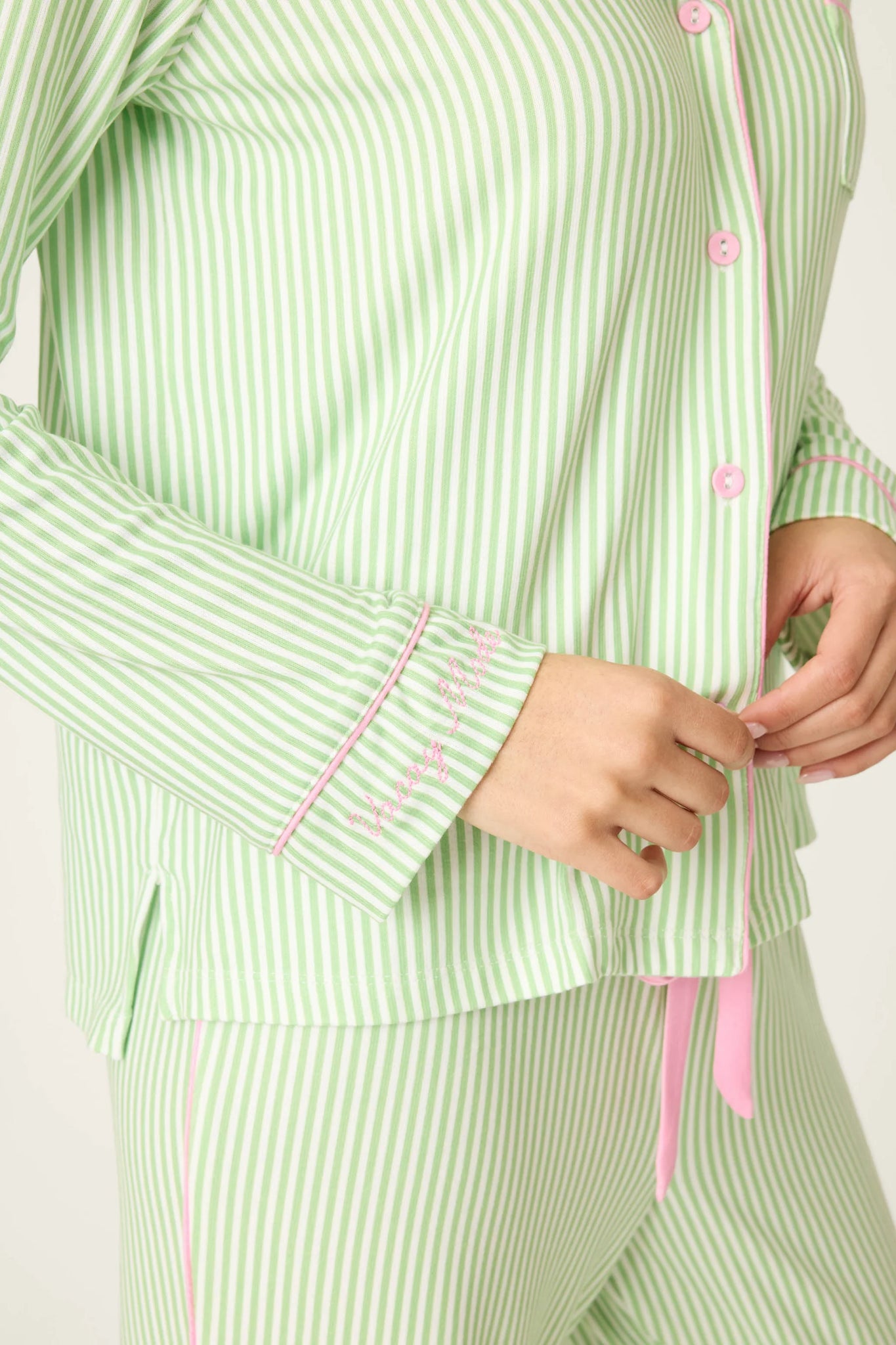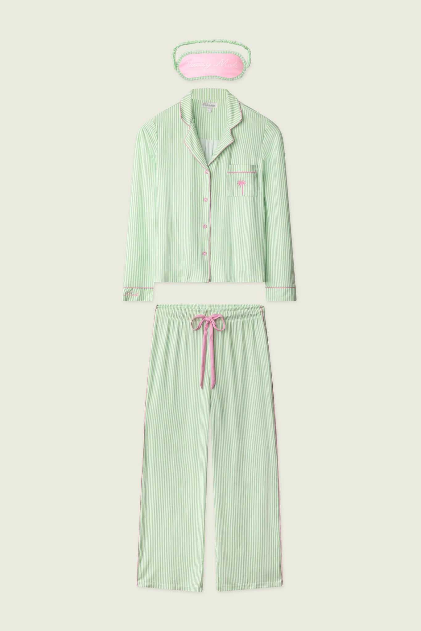 This green-and-white striped three-piece pajama set is fresh and feel-good, finished with cheerful embroidered details that add a subtle wink of charm. Crafted in butter-soft jersey, the button-front long sleeve top and easy drawstring pants are relaxed and comfortable, while the matching embroidered sleep mask completes the set with a thoughtful, fun-loving touch.