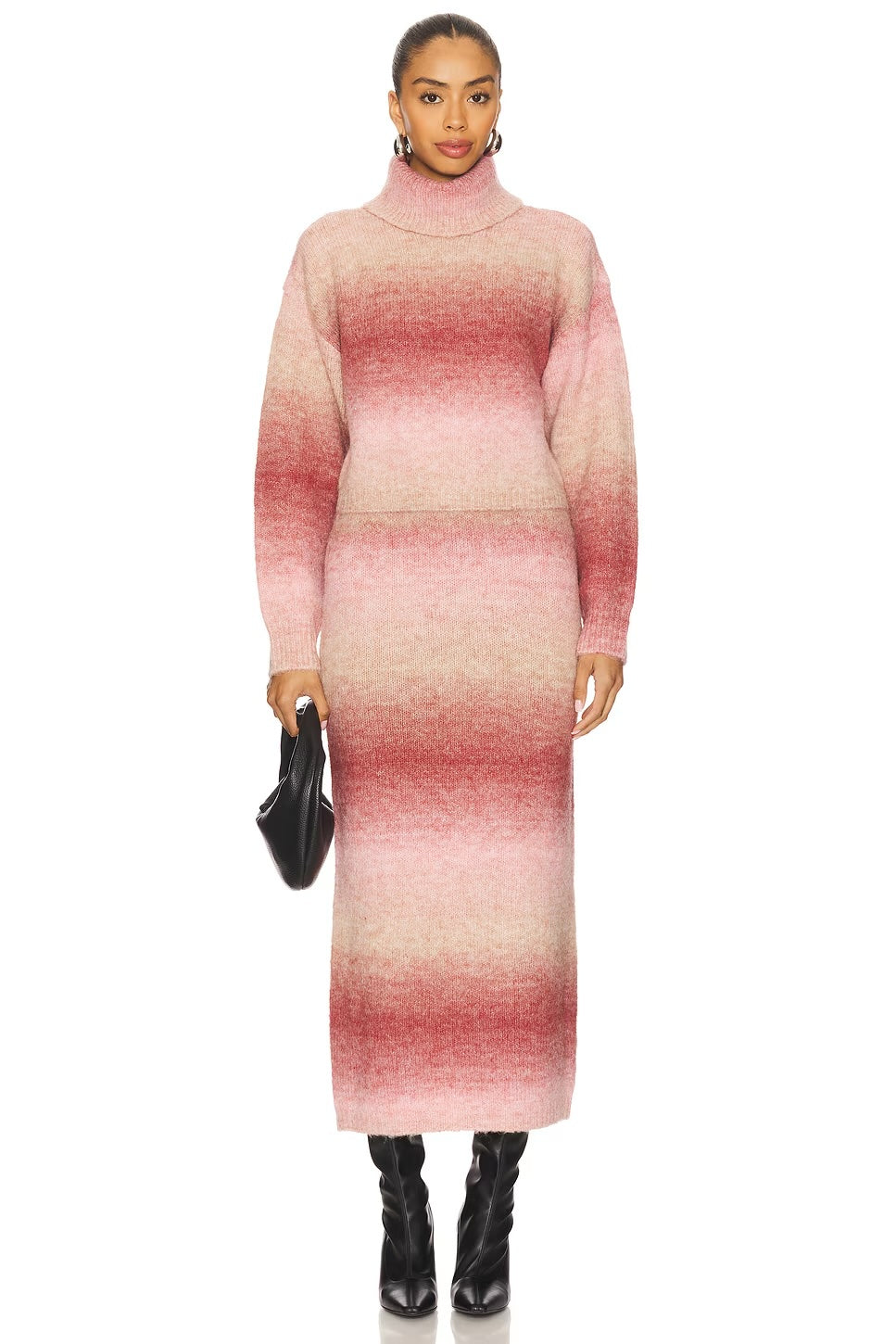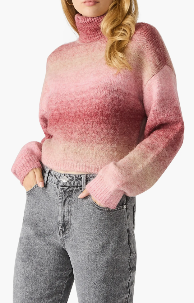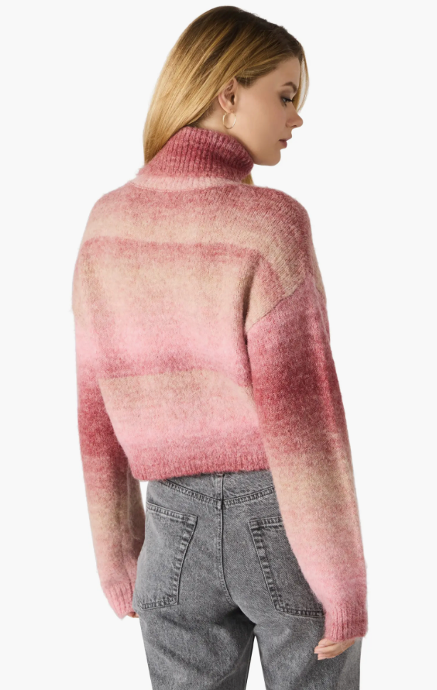 A wool-kissed sweater is striped in dreamy shades and topped with a snuggly turtleneck.
