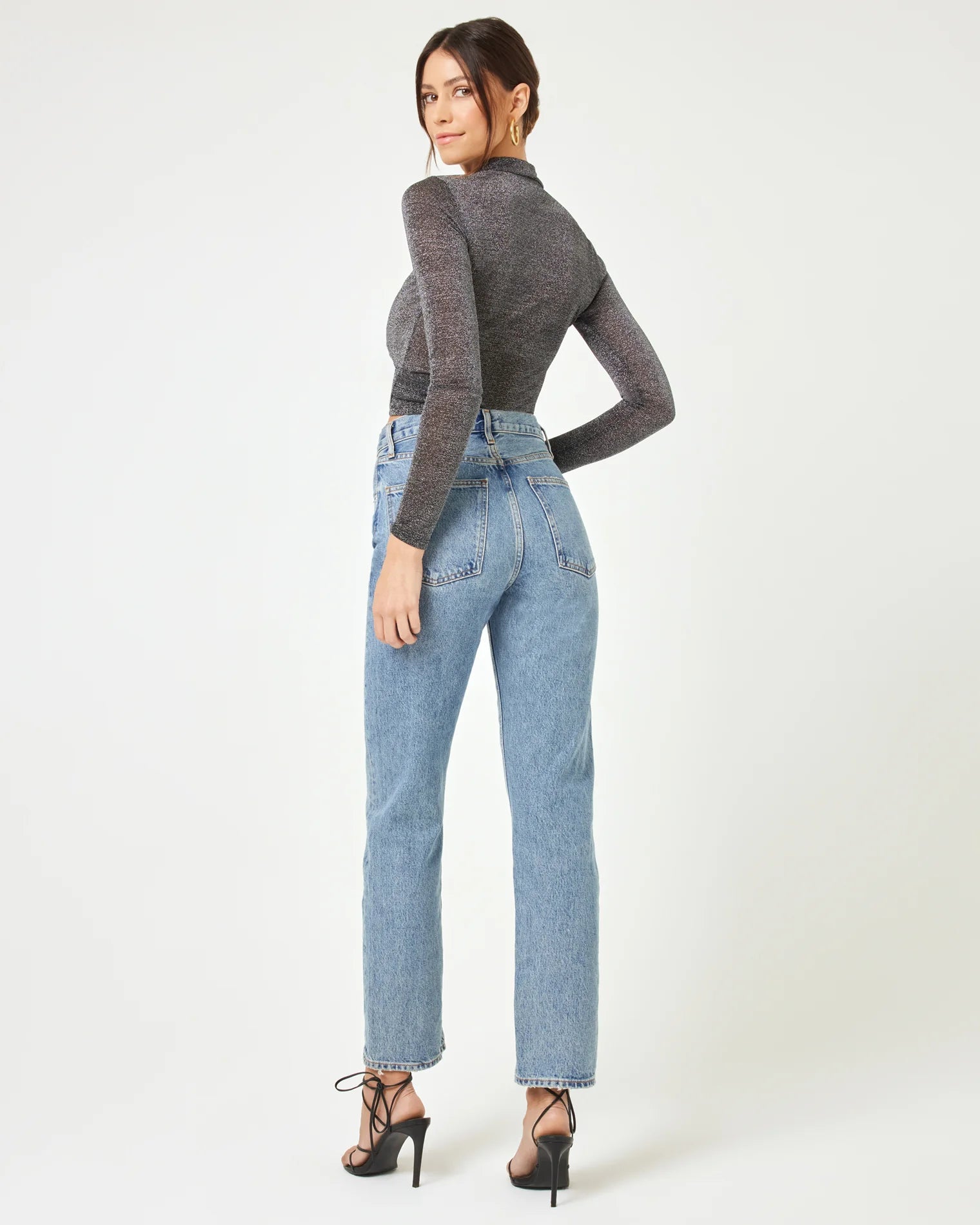 The Shimmer Long Sleeve is giving day-to-night energy. This mock neck top is made with a sparkly mesh material that pairs perfectly with a mini skirt and boots.