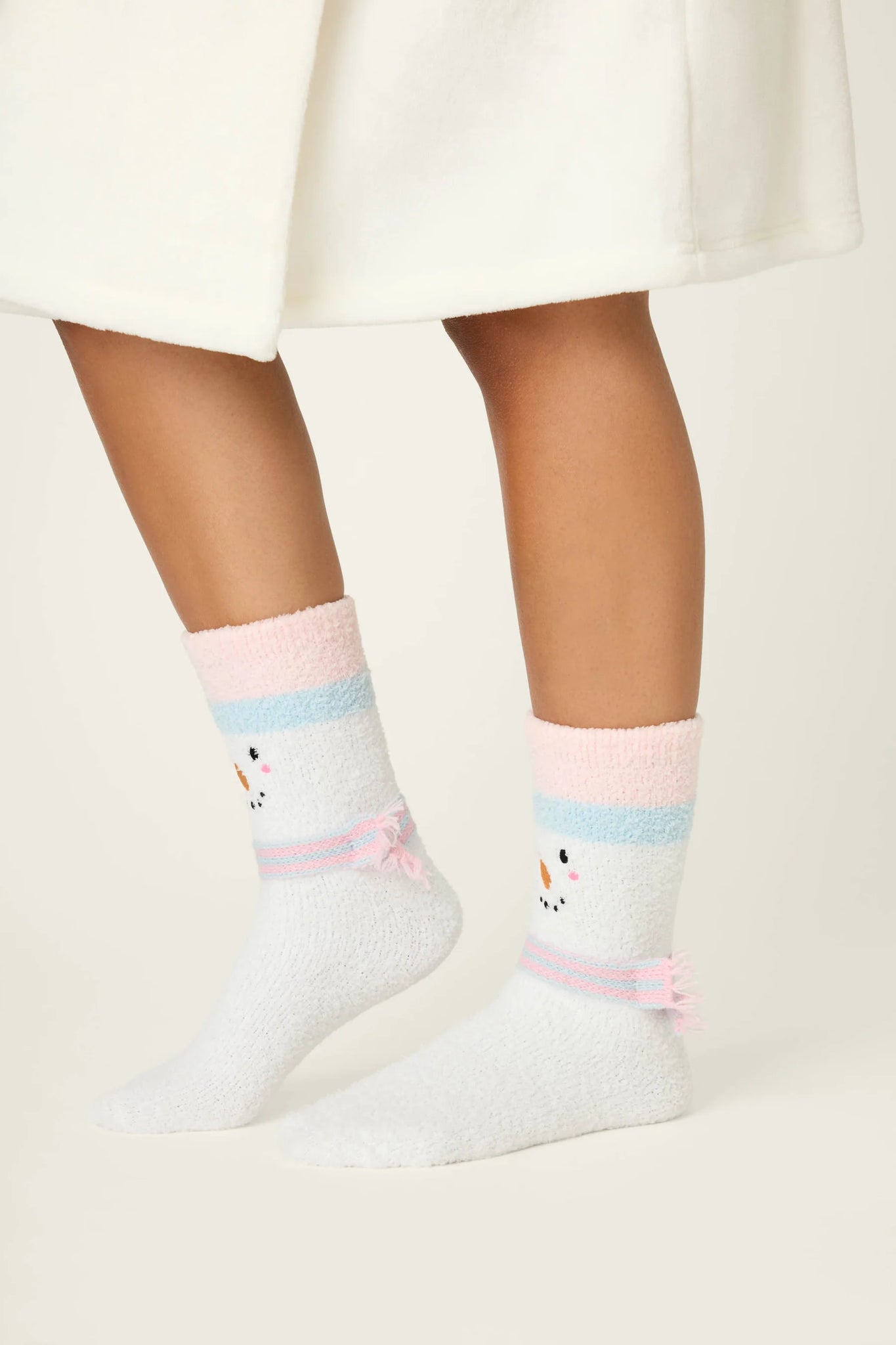 Snuggle into the holiday season with these white fuzzy socks, topped with a snowman face, striped scarf, and pastel-trimmed cuffs. Finished with gripper bottoms, they’re a playful pair made for cozy lounging, gifting, and frosty mornings.
