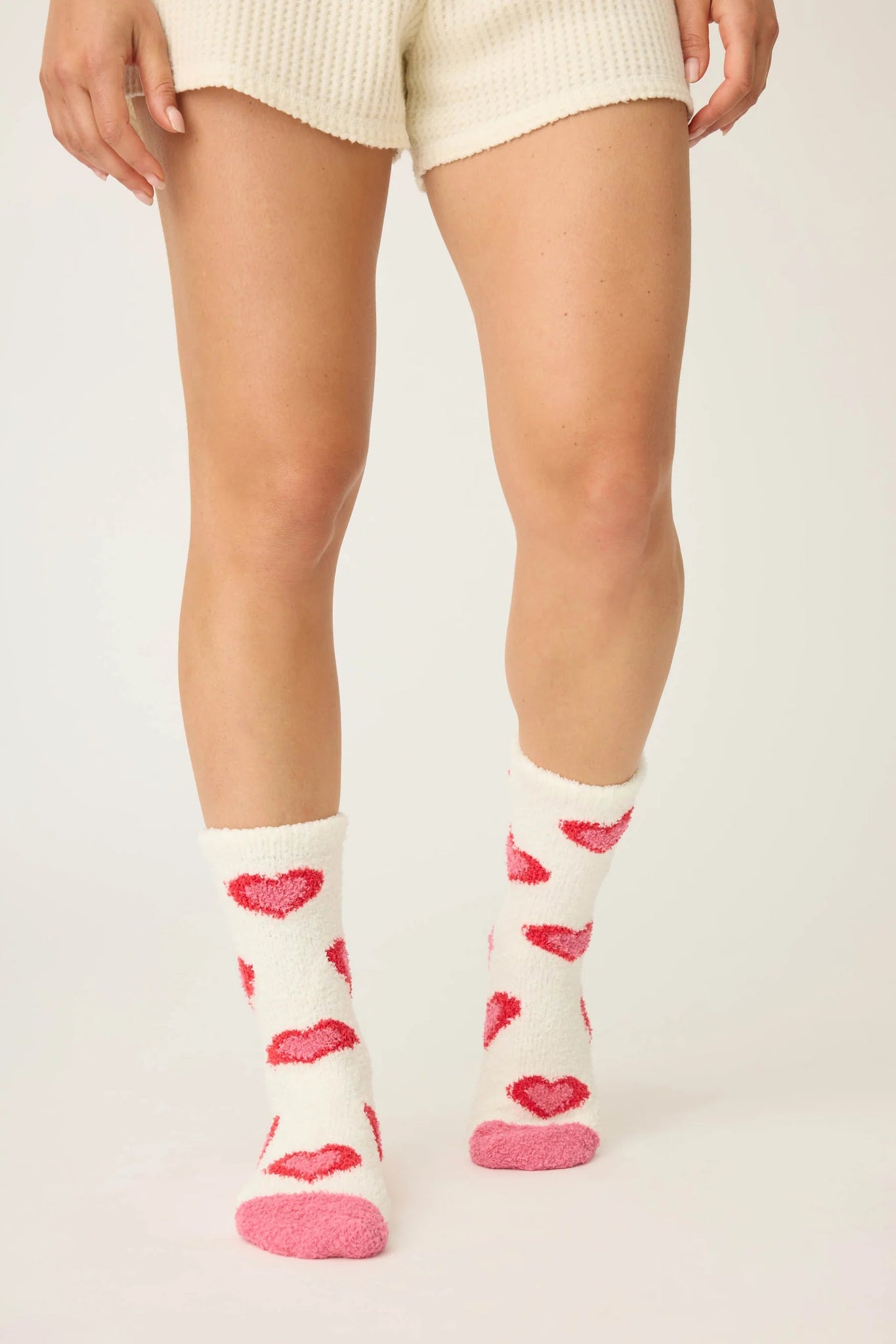For anyone with a soft spot (or just cold feet). These fuzzy gripper socks feature a heart print and candy-pink accents—made for cozy nights and cute moments alike.
