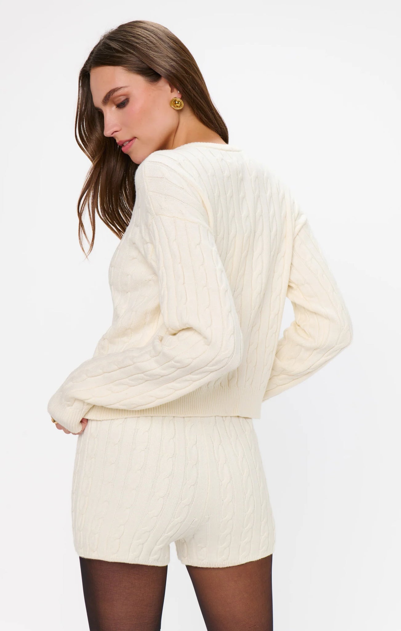 The Throw On Cardigan is the perfect layer for those days when you just want to throw it on and look effortlessly stylish. Crafted in a soft cable knit with a relaxed fit, it’s ideal for casual outings or cozy nights in. Pair it with jeans, leggings, or the matching micro shorts for a full on look!
