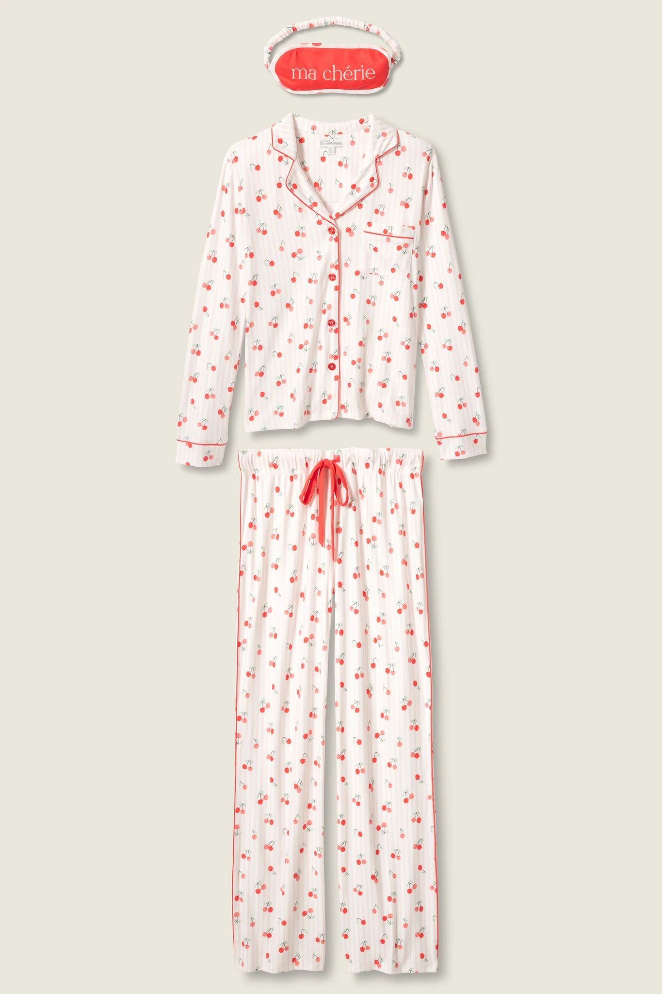 Sweet, juicy, and just a little cheeky. This three-piece pajama set features a relaxed button-down top and straight-leg pants sprinkled with red-and-pink cherries. Finished with a “Ma Chérie” embroidered eye mask, it’s ripe for cozy nights in.