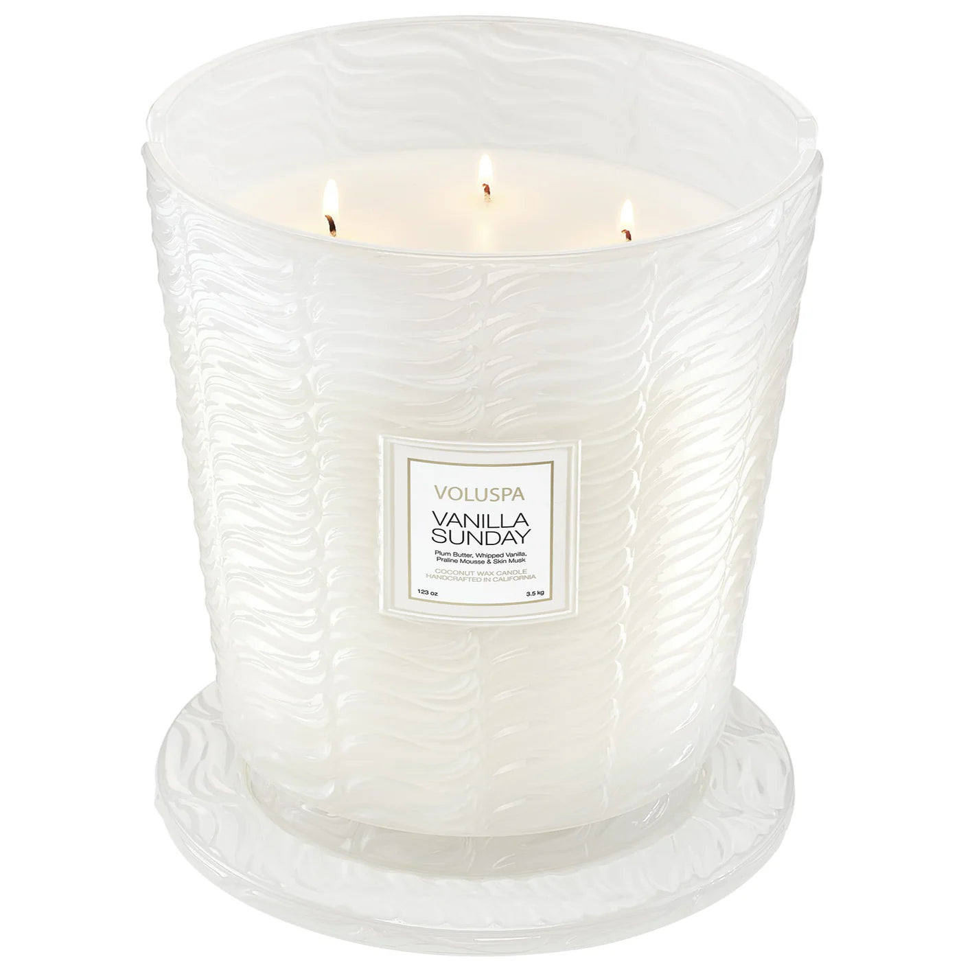 Voluspa Vanilla Sunday 5 Wick Hearth Candle: Sundays are not meant to be scary. Let your hair down and sink into a swirl of comforting sweetness. Invite cravings of endless possibilities and tantalizing inspiration with a dollop of velvety Plum Butter and airy Freesia. Whipped Vanilla and Praline Mousse melt into a soft cloud of Orris, Amber, and Skin Musk. Don’t worry about tomorrow, live in a Vanilla Sunday.