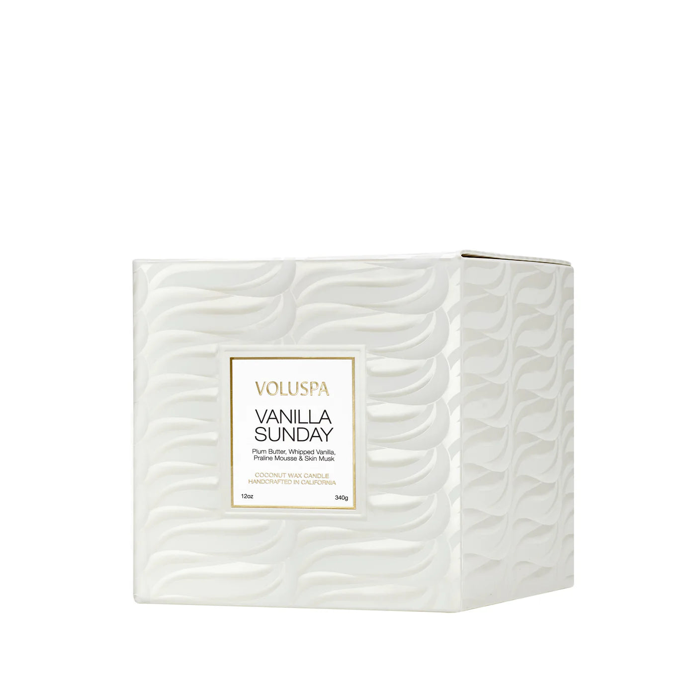Voluspas unique coconut wax blend is housed in a 9 oz. premium sculpted, swirly white glass with a tapered silhouette, packaged in a decorative box with white metallic accents. The single wick allows you to enjoy fragrance throw for 60 hours. Voluspa candles are handcrafted in the United States and feature proprietary, clean-burning coconut wax blend and natural wicks. Products are free of phthalates, pesticides, parabens and sulfates and are never tested on animals. Up-cycle this best seller into a keepsake after the last burn.