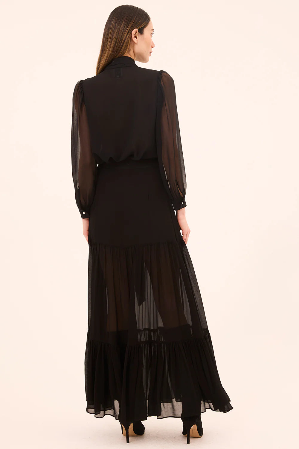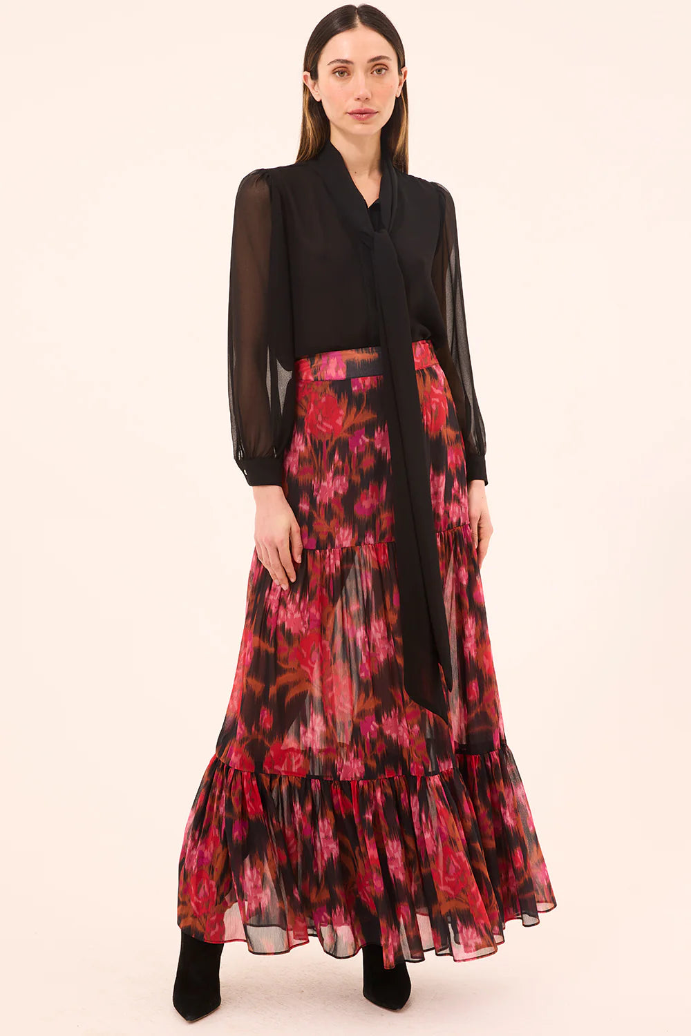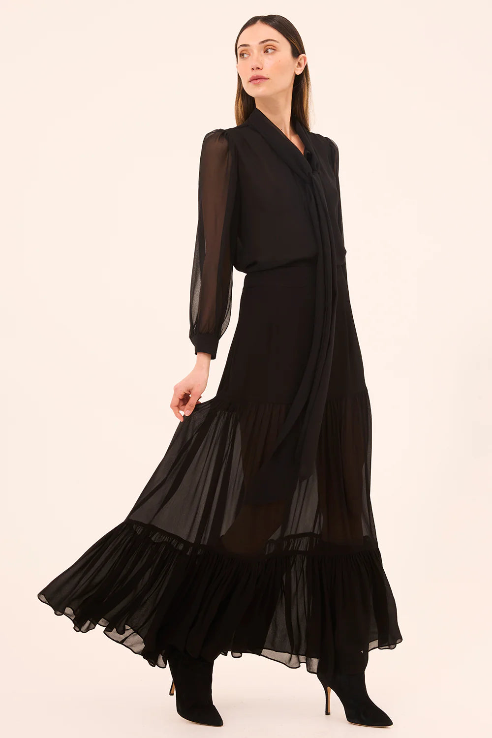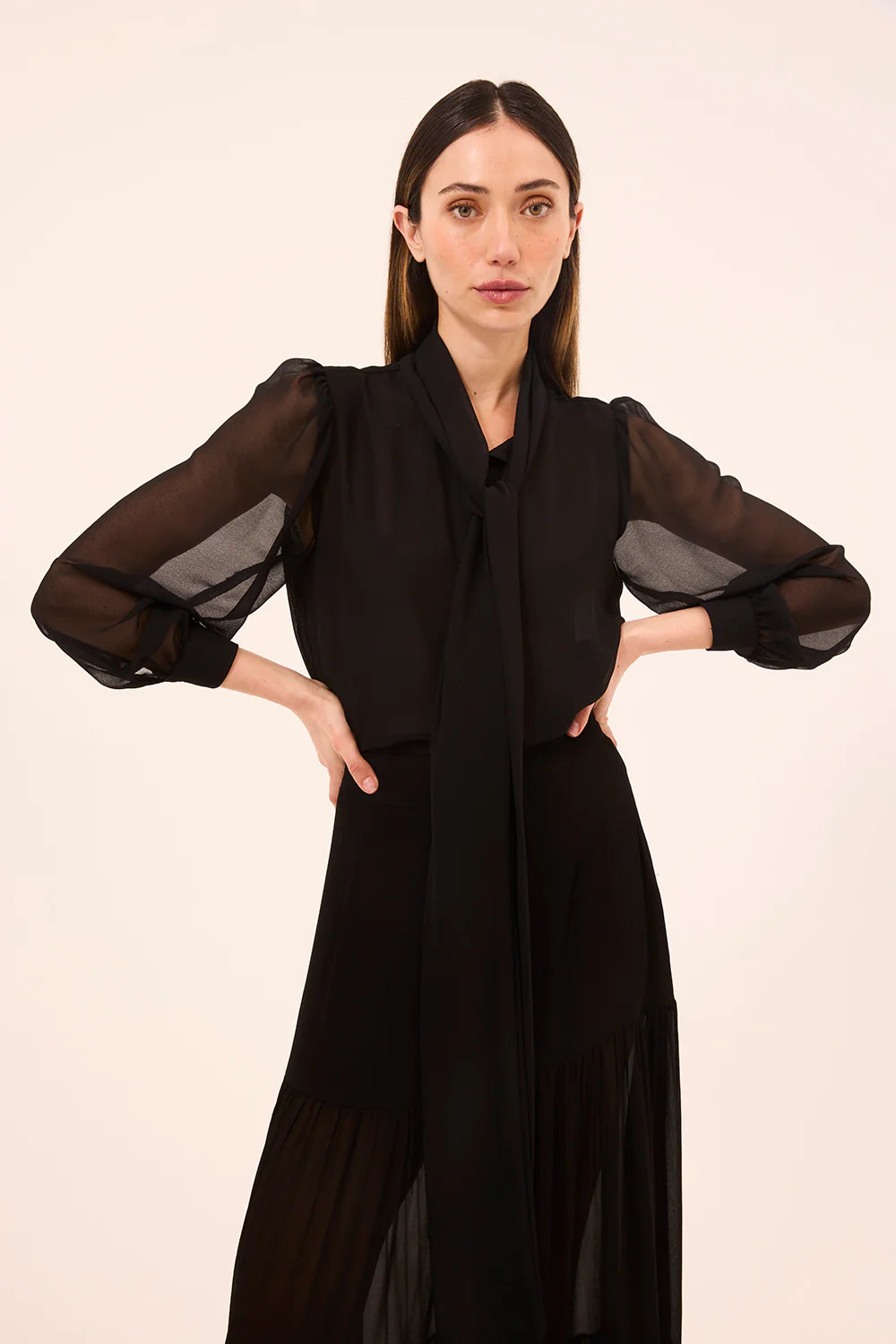 The Velma top is a timeless top cut from a silky black viscose chiffon. Designed with long unlined blouson sleeves and a self-lined bodice, it features a versatile pussy-bow necktie that can be worn tied or loosely undone for a more relaxed look. Pair it with the coordinating Mavi skirt for a monochromatic look, or mix it up with any of our printed skirts and pants. A classic top you will turn to time and again.